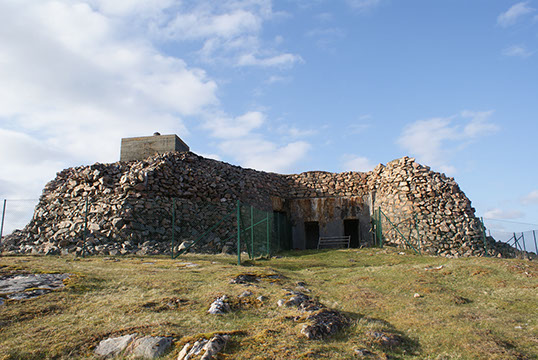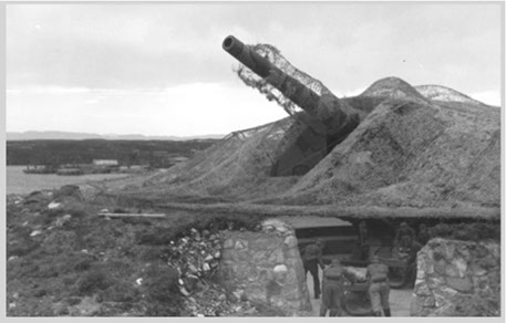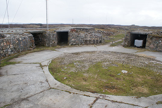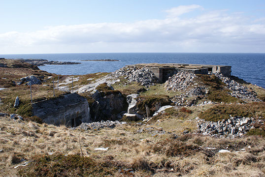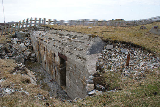 In the summer of 1940, the Germans started to fortify the island of Husöya, 50 km. northwest of Trondheim. These fortifications were continuously expanded and in the spring of 1941, a large radar station was erected, together with a gun battery with three 283 mm. guns. The guns came from Battery Goeben at Swinemünde and had a range of 35 km. They were set in open concrete posts and thus a field of fire around 360 degrees. To direct the fire from the three guns, a large command bunker was constructed, with a rangefinder mounted in an armored cupola on the roof. Organisation Todt had overall responsibility for the construction, using forced labour by mainly Russian prisoners of war. It is estimated that including the prisoners of war and the German soldiers, there were about 2.000 inhabitants on this small island.