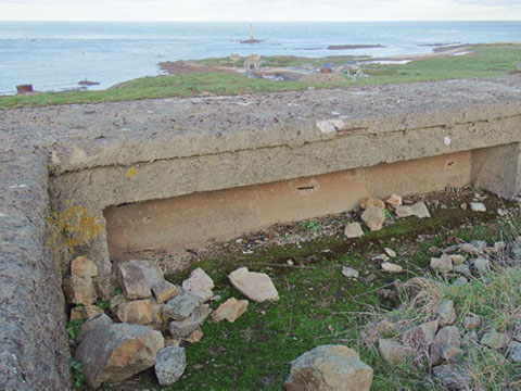 The construction of this gun battery started in spring 1942 on the slope 65 metres above sea level. It was built by the German army and comprised six 155 mm. guns which were placed in open ring positions. Each gun position was cast in concrete and had space for ammunition around the edge. By the end of 1943, it was decided to build casemates for the guns (R679) to protect them from air attacks, whilst limiting their range. Bunkers were also built for crew (R622, R621, R501) and ammunition (R134). The guns had a range of 23 km. and they could therefore cover the waters all the way to the Channel Island of Alderney which is 16 km. to the west.