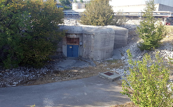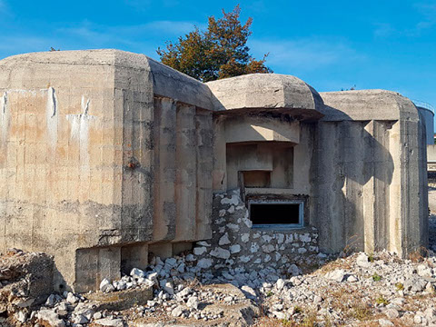 East of the important port at Rijeka, the German Army began installation of two bunkers in early 1944. These were both R679 bunkers. Each was armed with an Italian 90 mm. gun. Two more of these guns were placed in open ring positions nearby, with full a 360° fields of fire. These four guns had a range of 12 kilometers.
