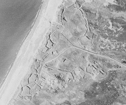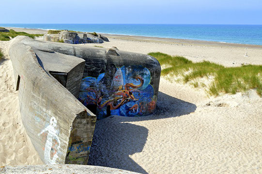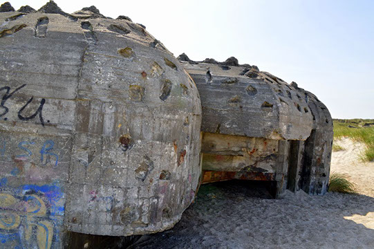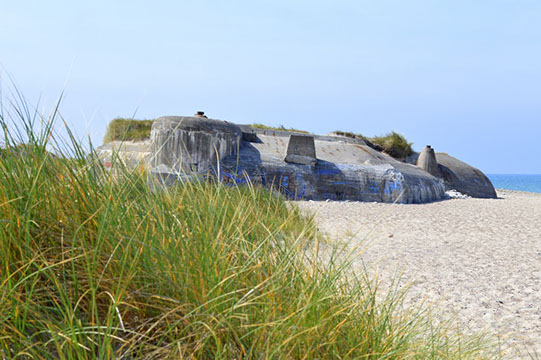 Resterne af de fire kanonbunkers ligger i dag på stranden eller i vandet, men bagved første klitrække er det er stadigt muligt at se de omfattende jordarbejder samt resten af de mange bunkers.