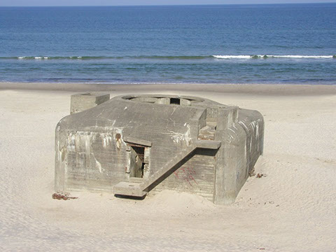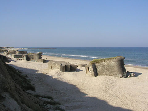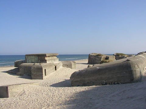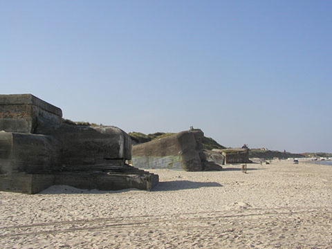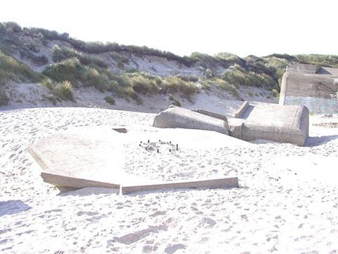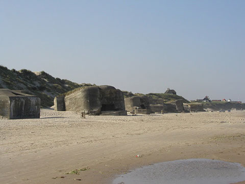 In late 1942 a gun battery of four 120 mm. guns taken from Denmark became operational. In 1944, the Danish guns were replaced for four modern German 127 mm. guns. The guns were located in fortified casemates, and were situated behind the first row of sand dunes. Due to erosion, the entire battery is now located on the beach.