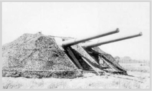 Canon Battery was equipped with four 105 mm. guns mounted in rotating armored turrets mounted on top of their casemates. In the center was the fire control bunker and separately a range-finder also mounted in its own revolving armored turret. Canon Battery was at that time equipped with the most modern equipment and therefore was extremely powerful. There were additional bunkers for ammunition, men and sanitation. The entire gun battery was enclosed within barbed wire, trenches, mines, pillboxes equipped with machine gun and mortar positions for point defense.