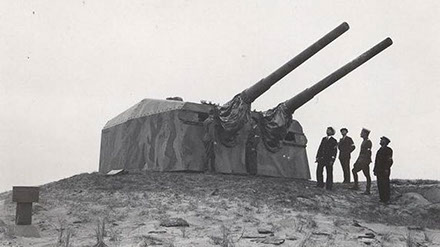The German battleship Gneisenau was badly damaged during an Allied bombing raid at Kiel in 1942. Subsequently, the main armament, which consisted of 283 mm. guns, triple mounted in turrets, was moved out to reinforce the German's Atlantic Wall. One of these turrets was moved to the island Sotra in Fjell, west of Bergen. Another was located Marine Gun Battery Oerlandet, to protect the entrance to Trondheim. The third and last turret was damaged during the bombing, but the guns themselves were installed at Hoek van Holland.