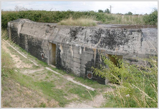 The battery at Grandcamp-Maisy, 4 km west of Pointe du Hoc, was established in 1942. The battery consisted of four 105 mm. guns. Three of these guns were built into pillboxes, while the fourth was in an open ring position. Additionally, there were six 155 mm. guns emplaced in open ring positions. The area was heavily built up with pillboxes and bunkers for ammunition, personnel, and close-in defense.