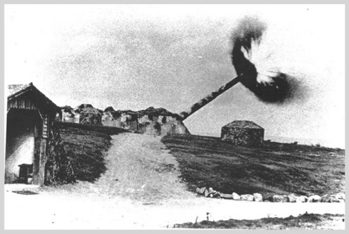 These guns were Russian and fell into the hands of the Germans during their occupation of Norway in April 1940. After a modernization at the Krupp plant in Essen, the guns were sent to Guernsey where they were mounted in separate pillboxes. The name of the gun battery was in honor of Kapitan-zur-See Rolf Mirus, who was killed in 1941 while sailing between Guernsey and Alderney. The guns were active throughout the war and fired regularly at Allied ships that came within the gun's impressive range of 51 km. The Germans in Guernsey and the other Channel Islands surrendered to the Allies 9 May 1945.